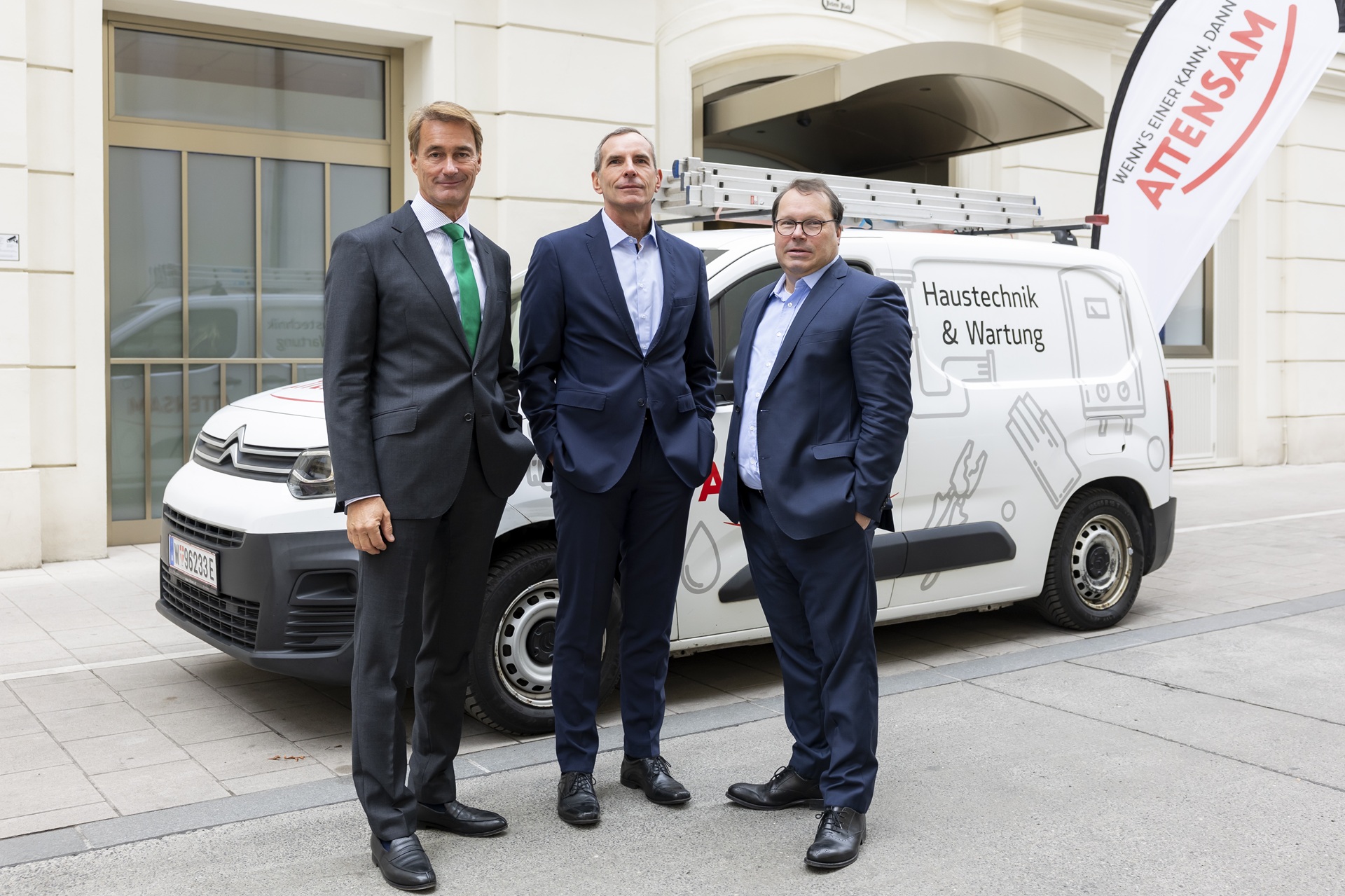 Oliver Attensam (Geschäftsführung Attensam Unternehmensgruppe), Michael Hackl (Geschäftsführung Attensam) und Peter Schrattenholzer (Geschäftsführung Attensam) vor einem Fahrzeug für Haustechnik & Wartung; © Attensam / Martin Steiger