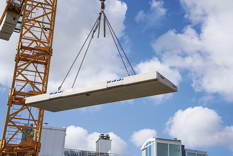 Just-in-time auf der Baustelle: Die Balkonplatte wird als Fertigteil an die Baustelle geliefert und mittels eines Krans zur jeweiligen Anschlussstelle des Gebäudes gehoben.