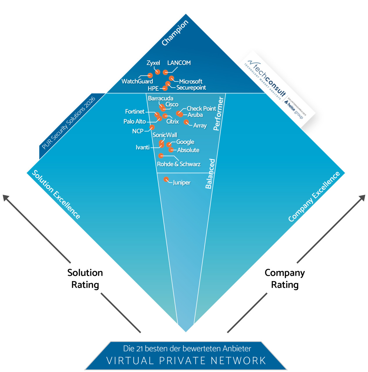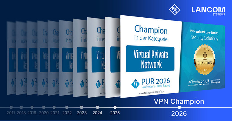 Mit einer herausragenden Gesamtleistung ist LANCOM Systems im „Professional User Rating Security Solutions" (PUR-S 2026) des Research- und Analystenhauses techconsult zum zehnten Mal in Folge zum Champion im Bereich Virtual Private Network gekürt worden. Die Auszeichnung bestätigt die führende Position von LANCOM Systems bei VPN-Security-Lösungen.