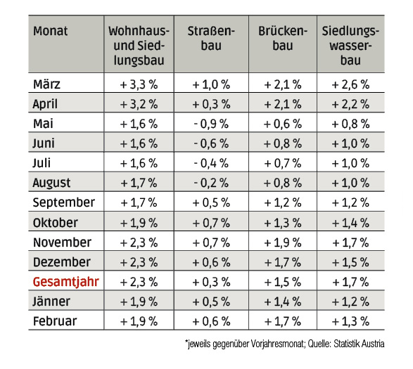Im Vergleich zum Vormonat Jänner 2026 stiegen die Kosten im Straßen- und Brückenbau um 0,2 %, im Wohn- und Siedlungswasserbau um 0,1 %.