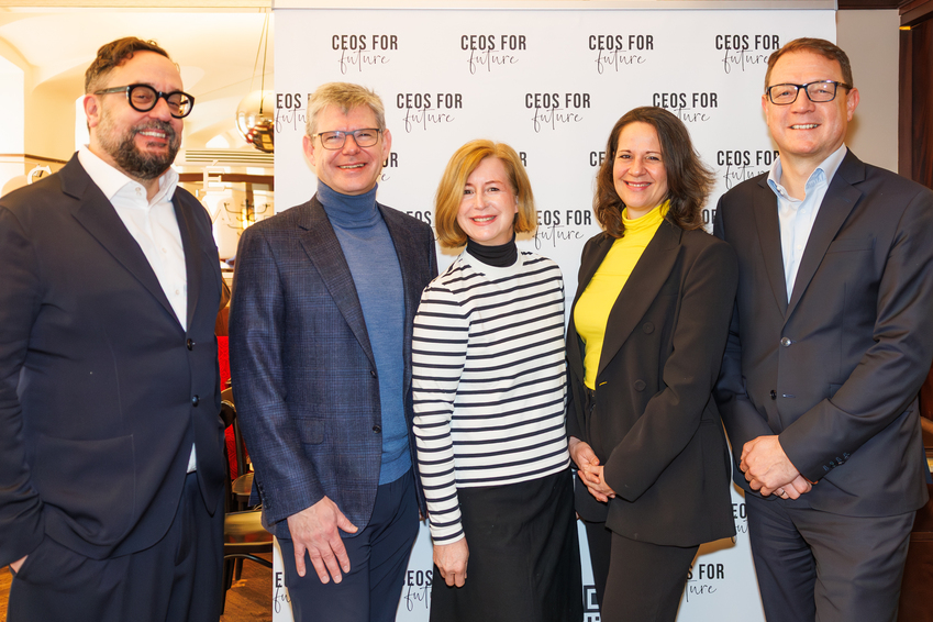 (v.l.n.r.): Martin Schiefer, CEO von Schiefer Rechtsanwälte I Rudolf Schrefl, CEO von Drei Österreich I Birgit Kraft-Kinz, CEO der CEOs FOR FUTURE GmbH I Christiane Brunner, Initiatorin Climate Business Circle und Vorständin CEOs FOR FUTURE I Marco Porak, Generaldirektor von IBM Österreich; ©CEOs FOR FUTURE / Martin Hron