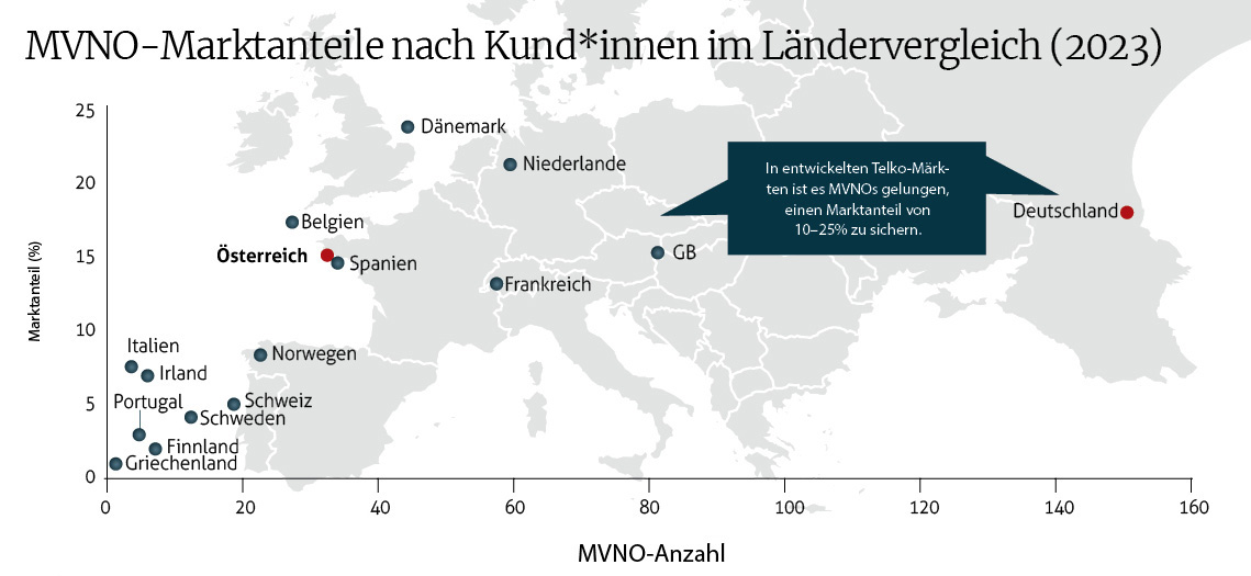 Ein entscheidender Erfolgsfaktor ist die regulatorische Umgebung. In der EU sorgt das Prinzip des diskriminierungsfreien Netzzugangs für faire Wettbewerbsbedingungen. Länder wie Deutschland, Frankreich und Österreich haben daher starke MVNO-Märkte entwickelt. Im Gegensatz dazu verhindern restriktive Märkte wie Thailand, Indien oder China durch hohe Lizenzhürden oder eingeschränkten Netzzugang den Aufbau dieses Marktes. In Österreich teilten sich im Jahr 2023 insgesamt 34 MVNOs und Sub-Marken der Netzbetreiber einen Marktanteil von 15 % der Userzahlen, der seitdem auch gestiegen ist (siehe Grafik). Trotzdem: Das Segment machte rund 250 Millionen Euro Umsatz aus – nur ein Sechzehntel des knapp 4 Milliarden Euro schweren Mobilfunkmarkts.