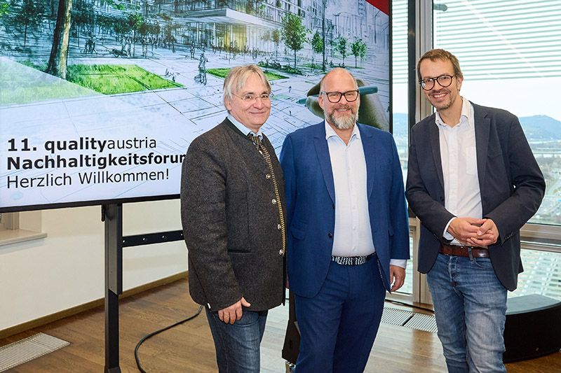 Bild: Martin Kreeb, Leiter der Professur für Nachhaltigkeitsmanagement, University of Sustainability, Charlotte Fresenius Privatuniversität; Axel Dick, Leitung Business Development Umwelt und Energie, ESG, Quality Austria Certification, und Fabian Christandl, Leiter der Professur für Wirtschaftspsychologie, University of Sustainability, Charlotte Fresenius Privatuniversität.